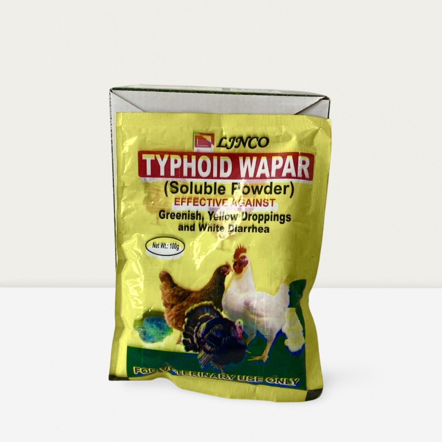 Linco Typhiod Wapar is a specialized medication for poultry that effectively treats bacterial infections causing greenish-yellow droppings and white diarrhea. This water-soluble powder contains powerful antibacterial agents that target Salmonella and E. coli infections in the digestive tract. When administered through drinking water for 3-5 days, it quickly reduces symptoms, prevents disease spread, and restores normal gut function. The fast-acting formula helps reduce mortality rates and improve flock recovery, with visible results often appearing within 24-48 hours. Always follow recommended dosage and observe withdrawal periods before processing birds for consumption.