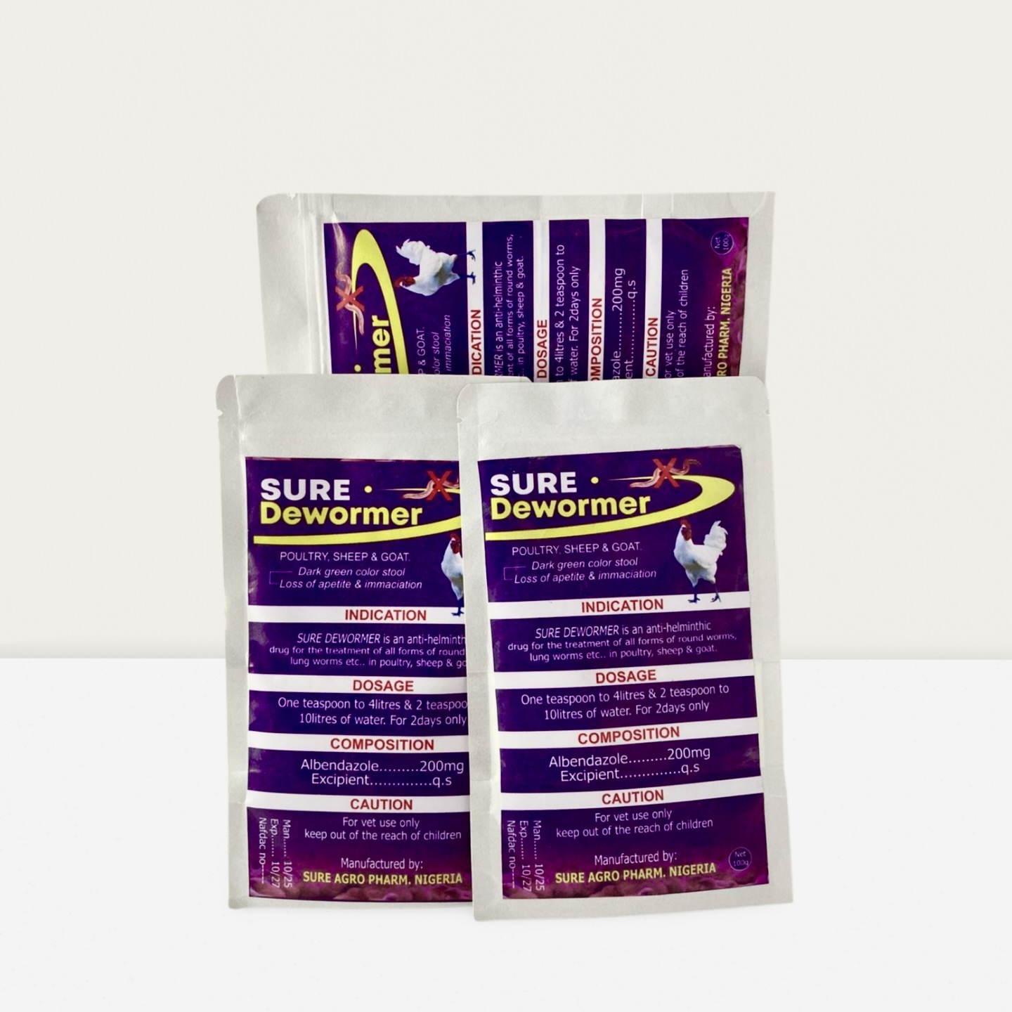 SURE DEWORMER is an anti-helminthic drug for the treatment of all forms of round worms, lung worms etc.. in poultry, sheep & goat.